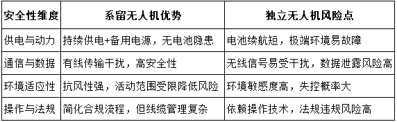 系留無人機在供電穩(wěn)定性、抗干擾性和惡劣環(huán)境適應性方面更具優(yōu)勢,尤其適合消防、軍事等高安全性要求的場景;獨立無人機則因靈活性和操作簡化更易普及,但需通過技術升級和嚴格操作規(guī)范彌補安全短板。